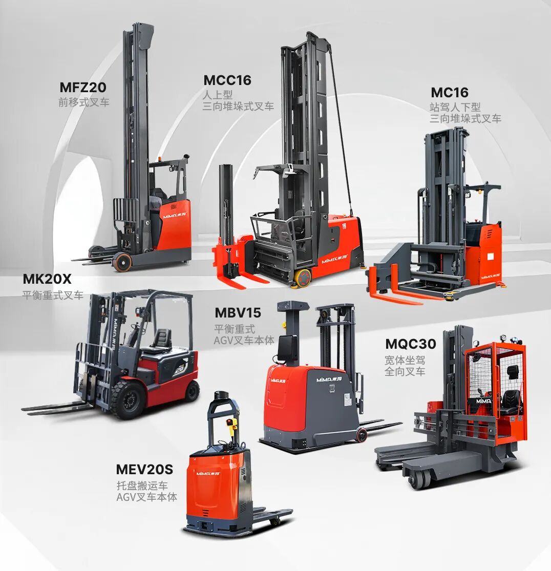 二十多年不断进取, MIMA 品牌以公司强大的科研创新团队为依托,以“安全、耐用、舒适、低碳(环保)”为设计理念,为客户提供500KG —100000KG应用解决方案、仓储设备及 相关服务。 通过不断的技术创新和专利积累,现在我们的产品已涉及12大类50多个品种,如电动托盘车搬运车、托盘堆垛车、前移式叉车、平衡重式叉车、牵引拖车、拣选车、窄巷道叉车、四向叉车、侧面叉车和非常物流设备、AGV、无人巷道堆垛机等等。产品广泛 应用于医药、食品、化工、电子、机械、家具、物流等各个行业。