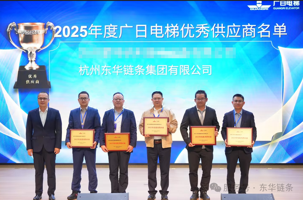 3月10日,东华链条受邀参加广日电梯2025年度供应商大会,凭借卓越的产品质量、稳定的交付能力以及优质的配套服务,再次荣获广日电梯颁发的“2025年度优秀供应商”称号,扶梯工程链事业部总经理汪希代表公司上台领奖。这是东华连续第二年获此殊荣,充分体现了广日电梯对东华链条长期合作的高度认可。