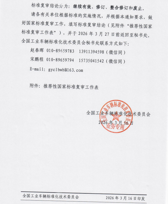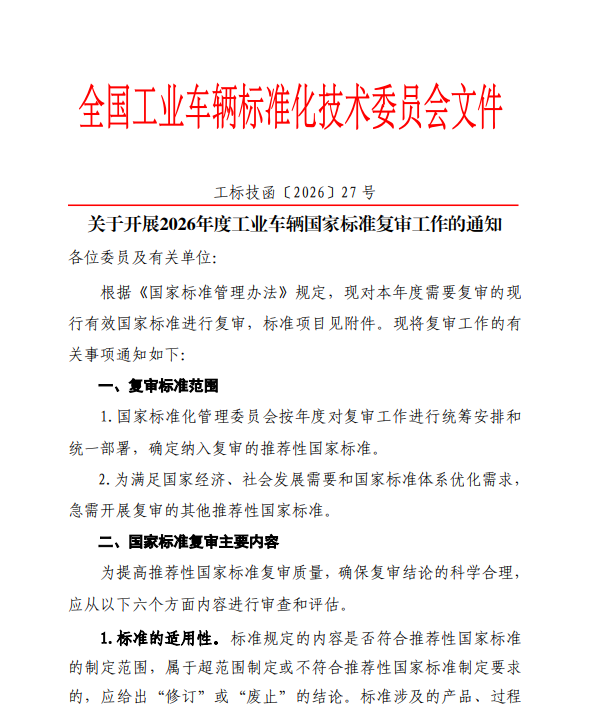 关于开展2026年度工业车辆国家标准复审工作的通知