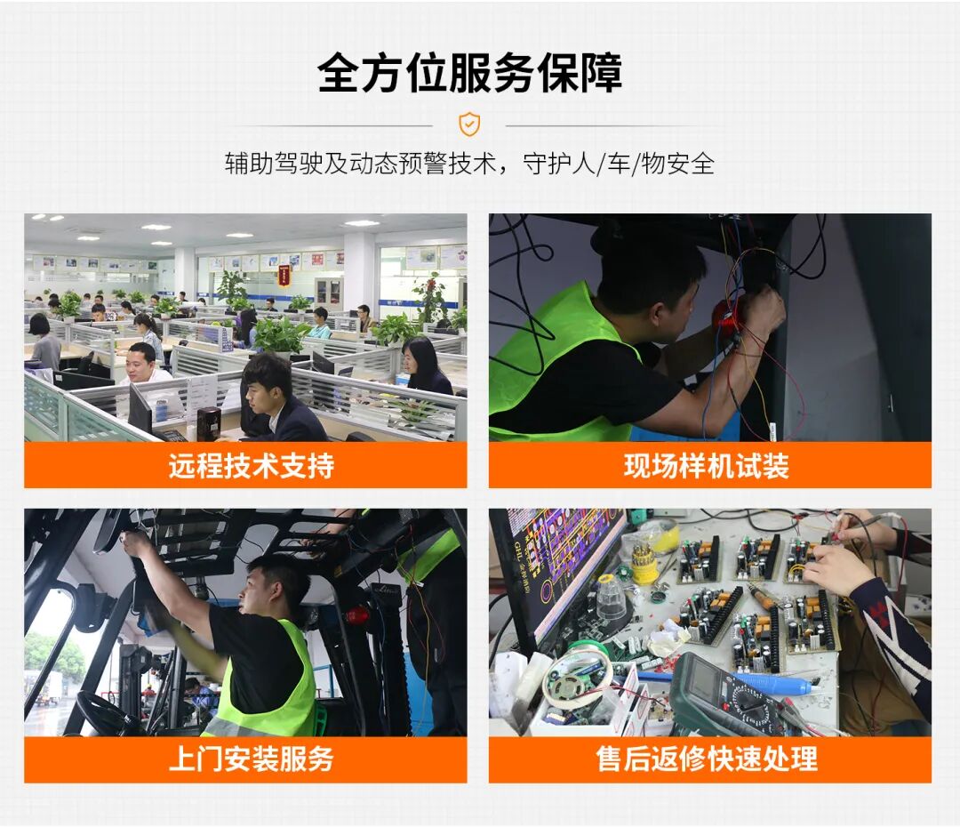公司核心产品系列——叉车防撞系统深度运用AI 视觉算法、雷达感应技术与UWB测距技术,覆盖叉车、正面吊、装载机等机械设备的智能防碰撞、超速报警、重量管理、车队管理等安全服务,精准构建“人、车、货、场”全场景风险预警与防护。