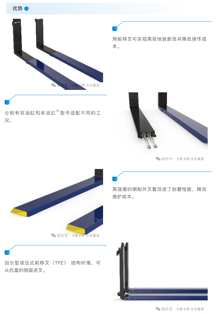 前移叉的同步系统确保了货叉运动的同步性,无需额外的分流阀;