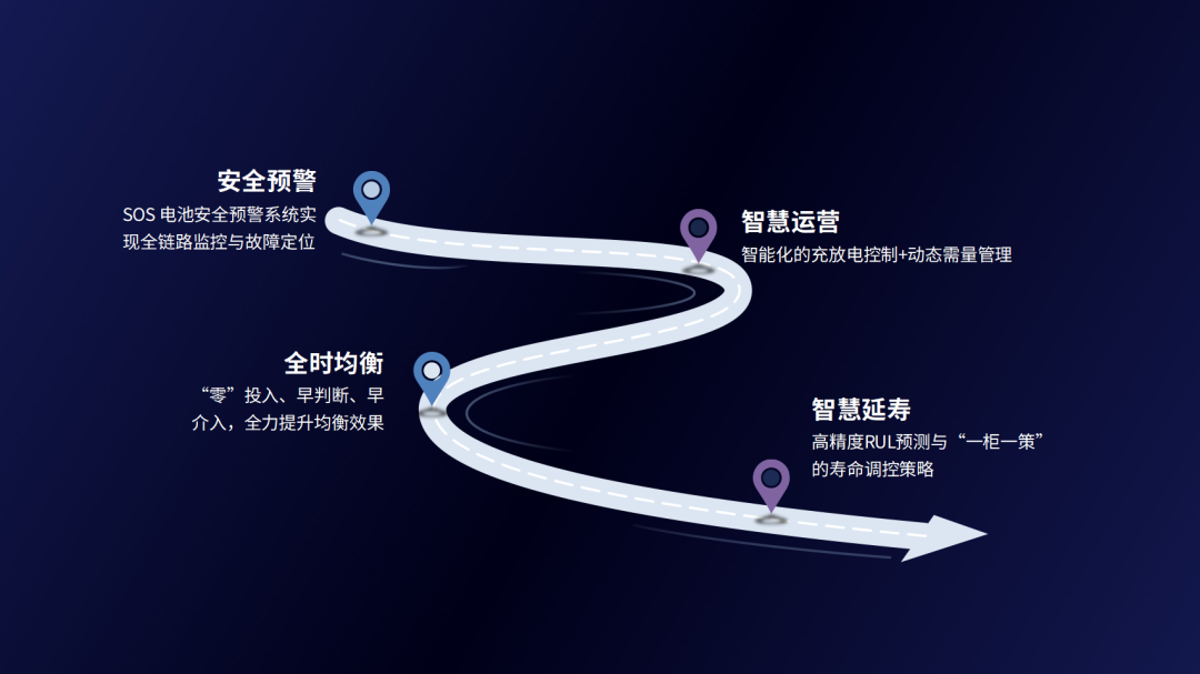 依托SOS电池安全预警系统,融合物理模型与AI算法,预警准确率超95%;通过云端全时均衡技术,精准识别电芯差异,早期消除“木桶效应”,提升可用容量;结合老化因子云端量化,为每台设备定制“一柜一策”优化工况,寿命延长两年以上;在智慧运营方面,AI智能调度实现收益导向的动态优化,让储能管理更高效、更安全。