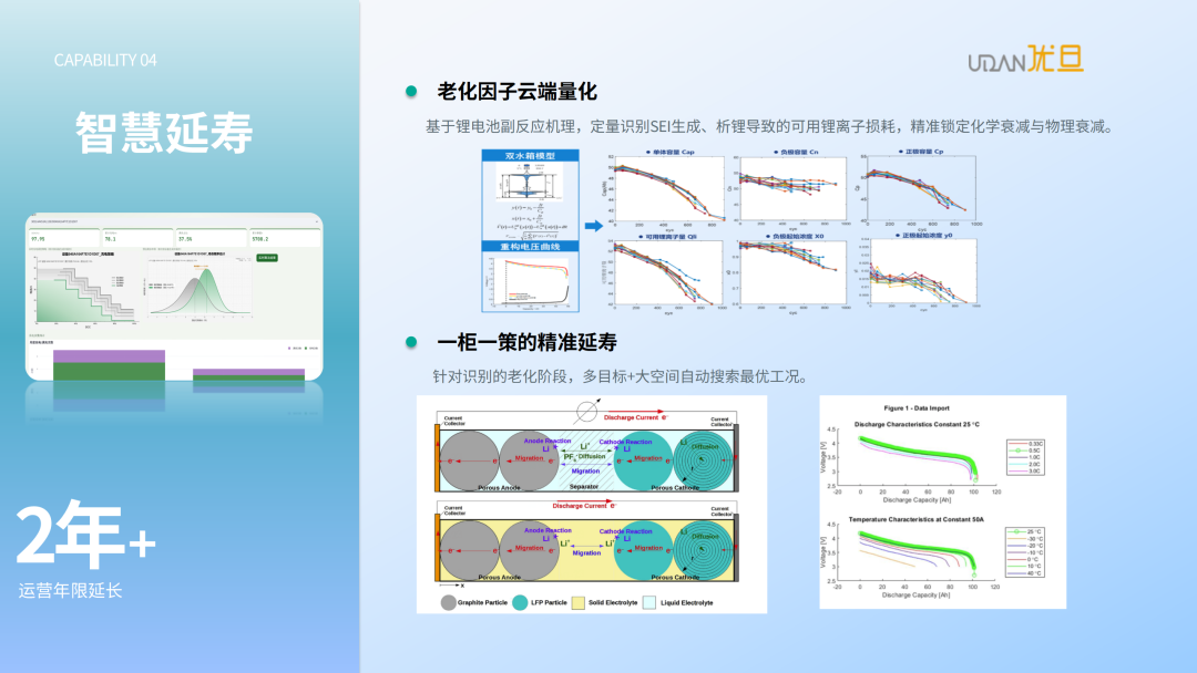 针对电芯衰减趋势不一致,衰减状态偏差的情况,优旦的解决方案是云端老化因子量化与实时参数寻优,通过多目标+大空间的贝叶斯优化体系,每次充电前自动搜索最优工况,实现一柜一策,精准延长设备内电芯寿命,避免木桶短板的出现,最大延寿2年以上。
