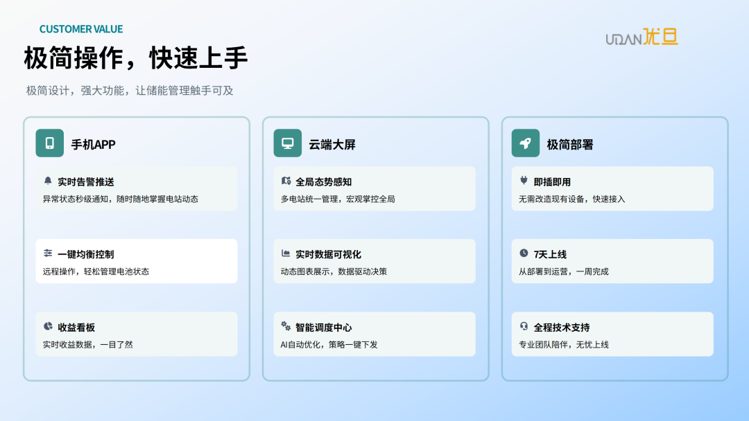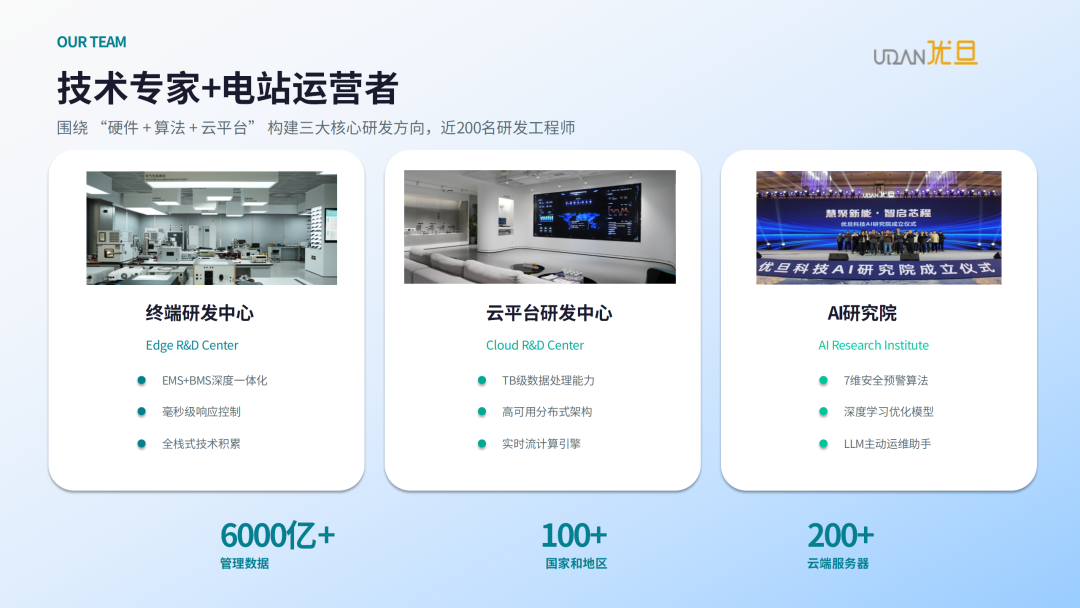 优旦科技具有十年能源数字化经验与6000亿条数据治理经验,部署有超200台云端服务器,我们有信心帮助客户实现云与端的全面交互,为电站运营提供优质的平台赋能,最终实现储能电站,安全无忧,运维无忧,盈利无忧。