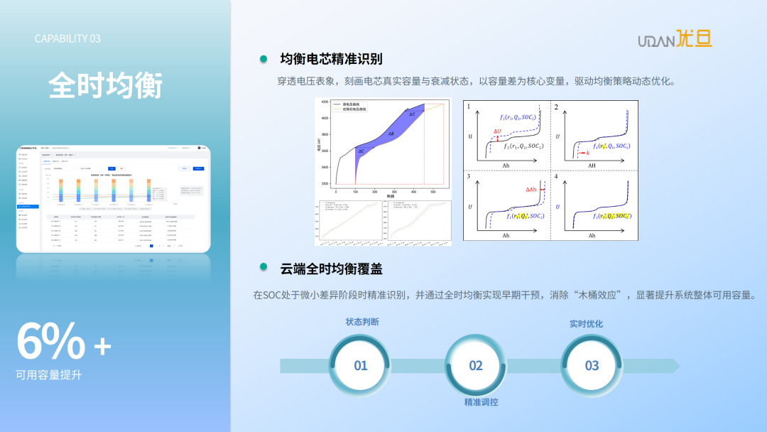 针对传统均衡方式效果不佳的情况,优旦提出了云端全时均衡方案,基于云端全时数据,结合能容映射与电芯曲线平移方法,刻画电芯真实容量与衰减状态,在SOC出现微小偏差的情况下,实现早发现,早干预,早治疗,显著提高设备可用容量超6%。