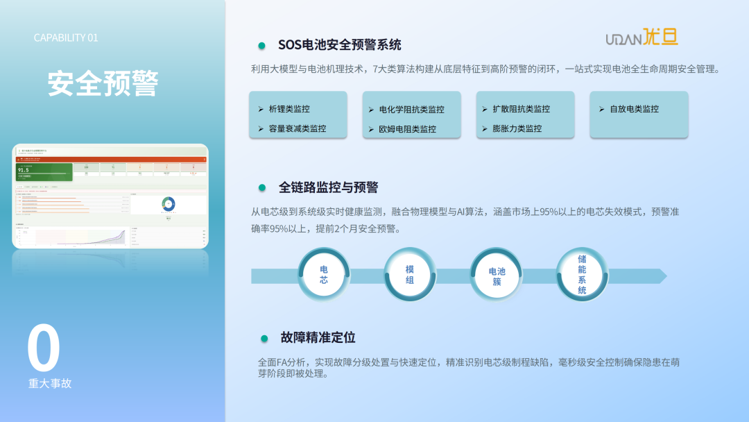 针对电芯潜在热失控风险,优旦提出了SOS电池主动安全预警系统,基于电芯失效机理算法结合transformer大模型架构,围绕7大失效算法子模块构建多维算法预警墙,实现一站式电池全生命周期安全管理。目前我们已实现单电站下全量电芯的全链路监控与预警体系,通过多维FA分析,精确识别电芯制程级缺陷,确保消灭隐患于萌芽阶段,实现提前两个月识别超过95%的热失控风险事件,保障重大事故0发生。