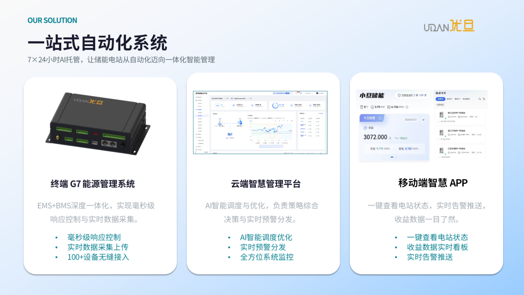 有了上述能力的支持,我们有底气地宣布优旦科技2026年度储能新品:AI+端云一体智慧管理系统——实现储能电站7×24小时AI托管,从自动化走向一体化智能管理。