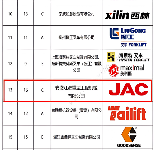 在近期发布的2025年中国叉车制造商排行榜中,江淮重工排名实现连续跃升:2024年由第16位上升至第13位,2025年更进一步,由第13位攀升至第11位。年度递进,持续攀升,江淮重工以优异成绩书写了改革发展的优异答卷,充分彰显了企业在行业中的竞争力与成长潜力。