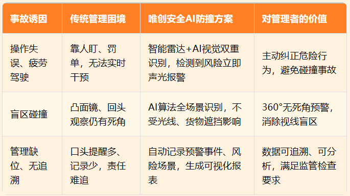唯创安全始终聚焦叉车使用阶段的核心安全痛点,以AI防撞预警系统为企业提供主动预防式安全防护,帮助企业降低事故风险、落实主体责任、适配监管要求。