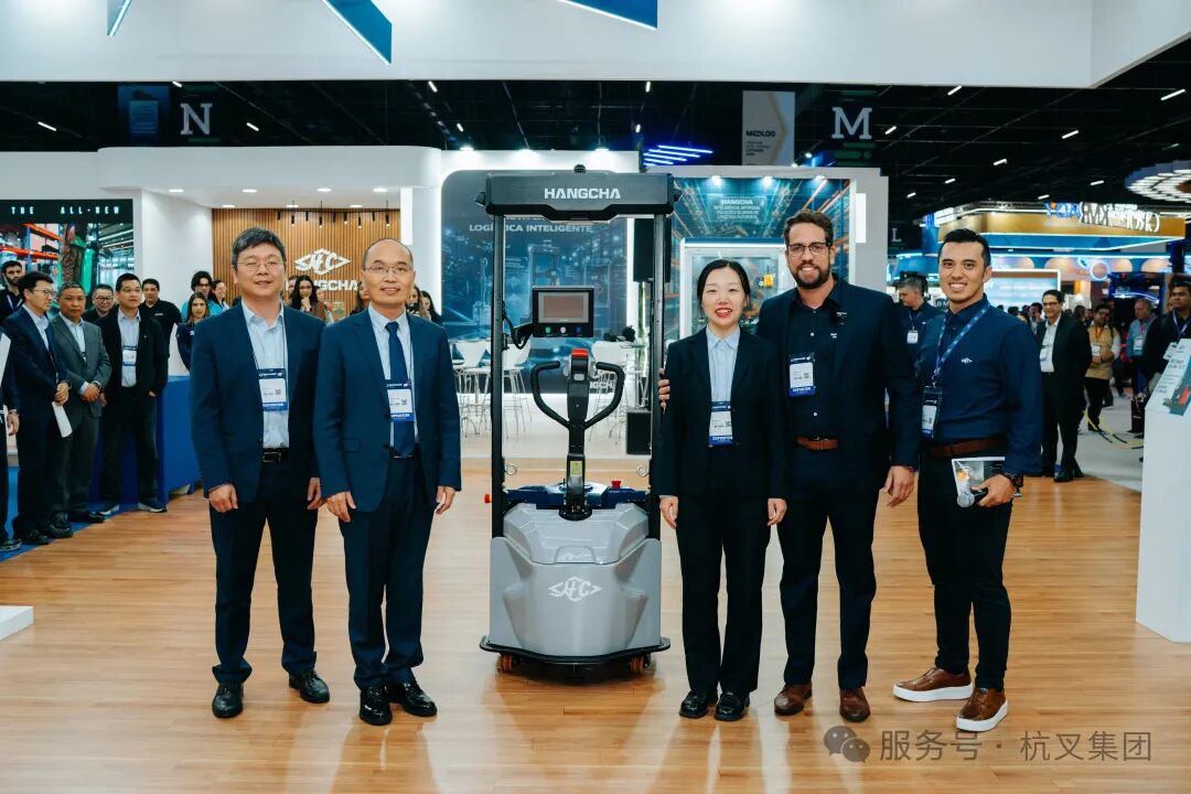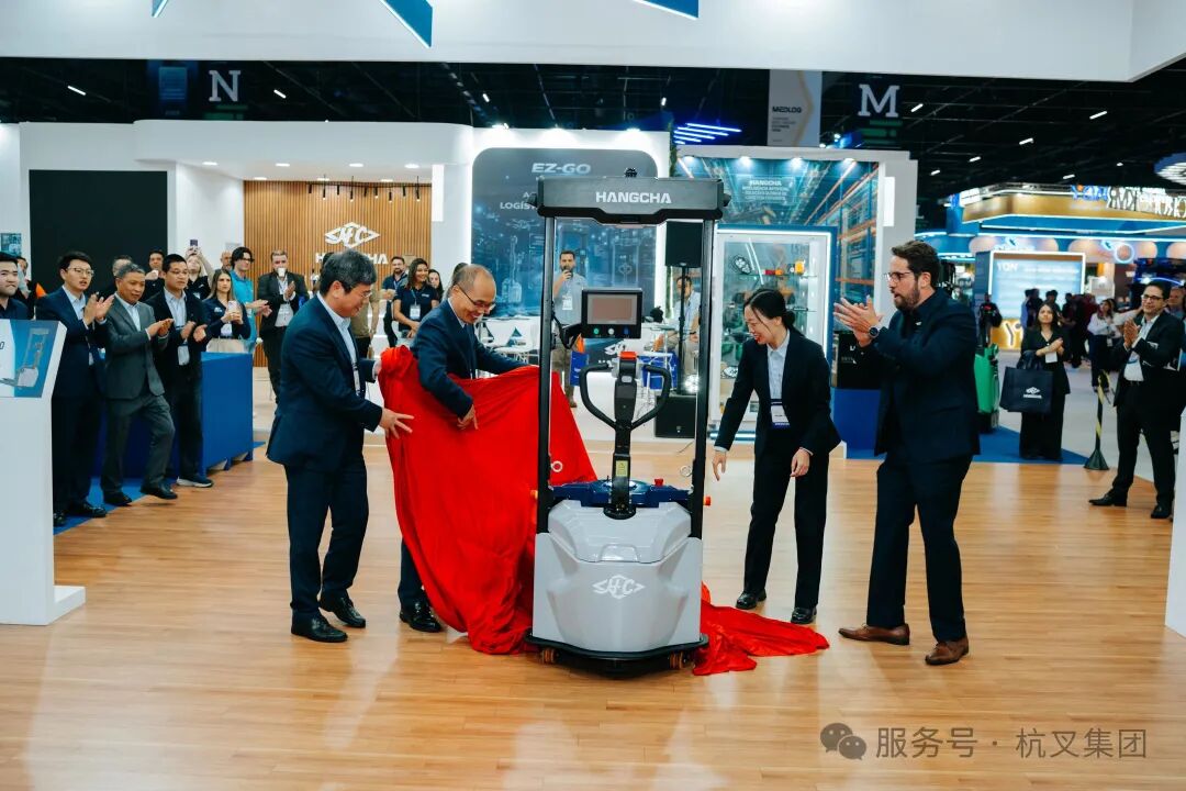 全球领先的叉车制造商杭叉集团携全系列创新产品强势亮相展位号M013。展会首日,杭叉集团副总经理李元松、杭叉进出口副总经理潘敏杰、杭叉巴西总经理罗纯等公司领导共同出席了2.0吨EZ-GO搬运AMR的新品揭幕仪式。随后,罗纯向拉美市场正式发布这款智能化新品。