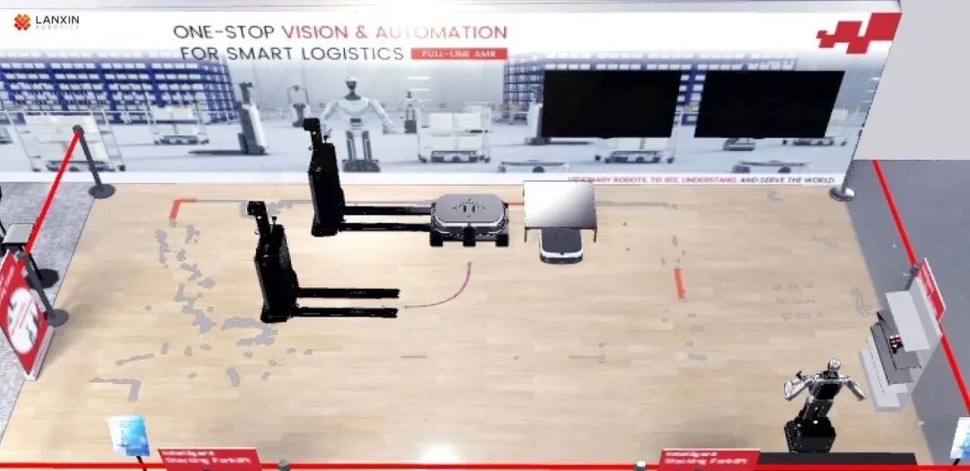 围绕AI与智能物流的深度融合,蓝芯机器人在展会现场系统展现了其智慧工厂物流解决方案:通过“3D视觉 + 工业AMR + 智能调度系统(RCS)”的协同架构,实现从感知、决策到执行的全链路闭环。