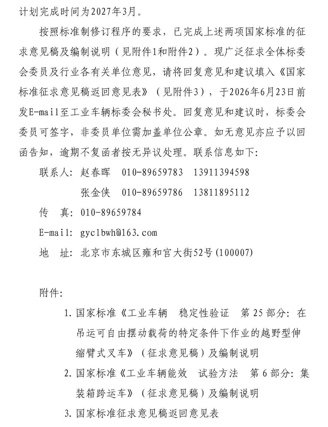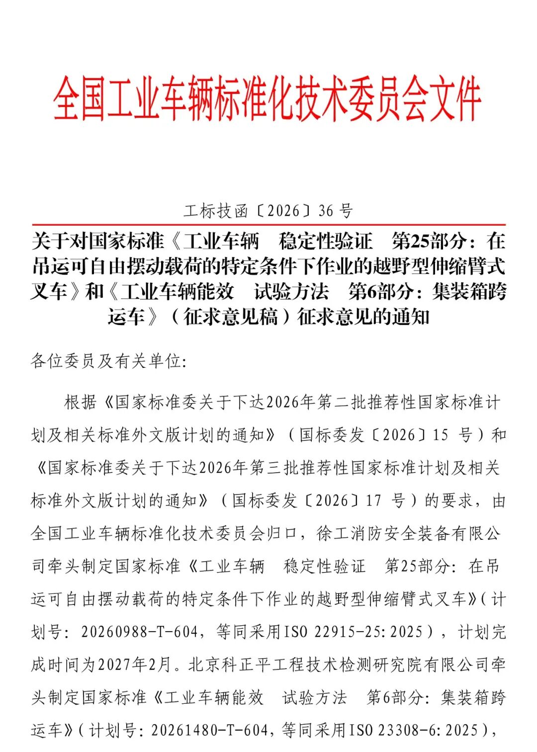 关于对国家标准《工业车辆 稳定性验证 第25部分》和《工业车辆能效 试验方法 第6部分:集装箱跨运车》(征求意见稿)征求意见的通知