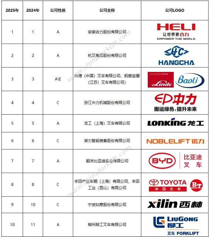 2025年中国叉车制造商排行榜