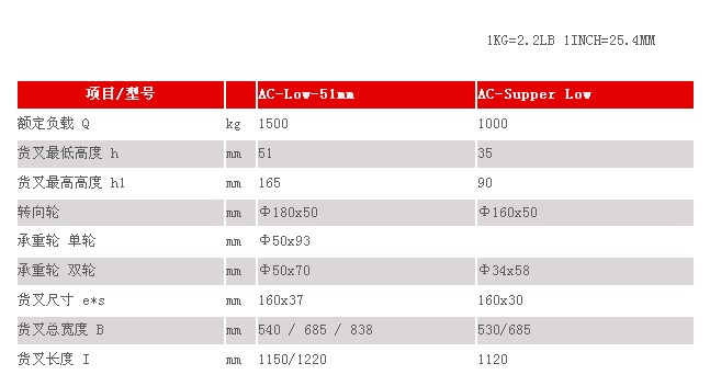 产品名称:低放货叉 手动搬运车 产品介绍: 超低型手动搬运车 低放型车适用于托盘低矮、空间狭窄的工作场合; 整体式铸造油缸,油缸下降速度不受载重的影响; 采用进口密封圈, 活塞杆镀铬; 内部溢流阀提供过载保护,有效降低维修费用; 旋转轴连接处采用高品质向心滚子轴承,灵活不抖动; 一体式铸造轮架,并装有前后导向轮,保护配装轮免受撞击,延长轮子寿命; 提供不同的货叉长度/宽度; 提供尼龙/橡胶轮供不同工况使用; 可选停车制动功能:手制动/脚制动; 车身颜色可根据客户要求提供。