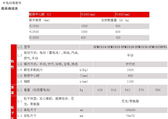 产品名称:SPM15半电动堆高车 产品介绍: 强度更高的结构设计美观的外形、流线型的轮廓使其显得异常出众 高质量的钢材确保车辆拥有出色的稳定性和强度 内置充电器使充电更方便 转向轮防护和安全罩让您的操作更放心 机械刹车机构使车辆在任何情况下都能够实现安全停车