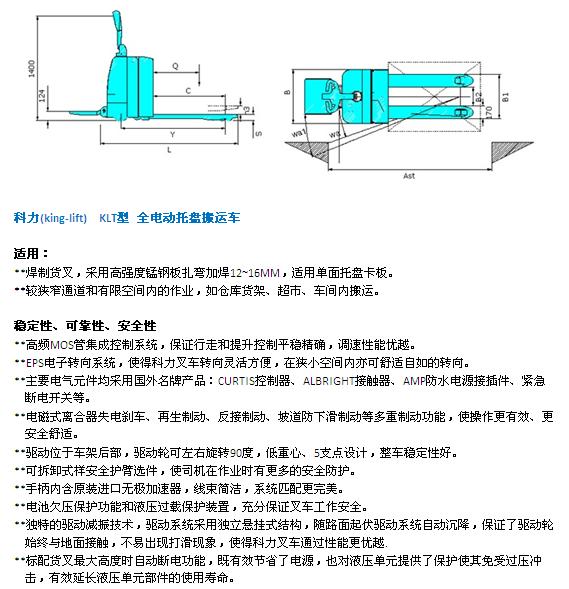 科力king-lift全电动托盘搬运车KLT系列,集成的电子控制系统,采用主动悬挂驱动减振技术,免维护交流电机,叉车的性能诊断接口使得工程师调整叉车性能参数、预见性的维护及快速修理变得十分方便.。