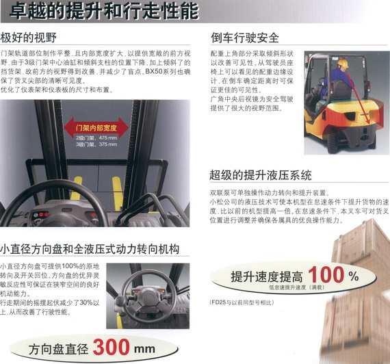 1、如何设计叉车才能达到管理人员、驾驶人员以及精心堆垛货物的需求呢?正是为了满足这些需求,小松公司通过潜心研究推出了全新型BX50系列叉车。