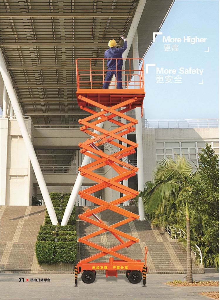 SJY系列移动式液压升降台广泛应用于高空安装、维修、装潢、清洁等需要移动作业的场合,亦可作为短距离搬运、平行装卸货物的工具。它的剪叉式机械结构,使升降台起升后有较高的稳定性,宽大的作业平台和较高的承载能力,使高空作业范围更大,并适合多人同时作业,使高空作业更方便、更搞笑、更安全。