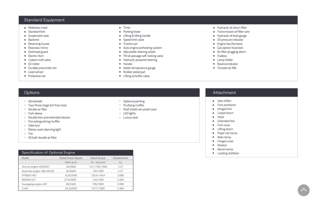 高质量的发动机和变速箱的完美组合.大幅度增强了牵引力、爬坡力和起升速度.提高了叉车的工作效率。
