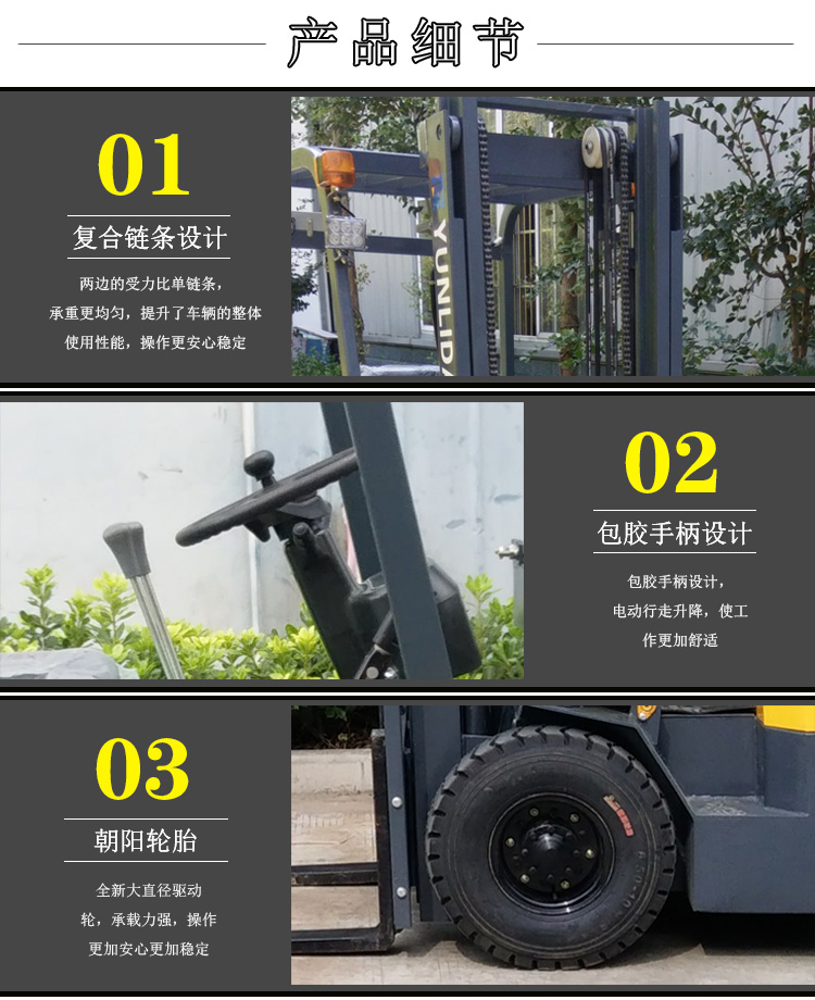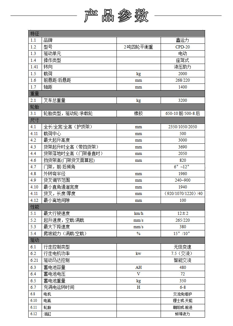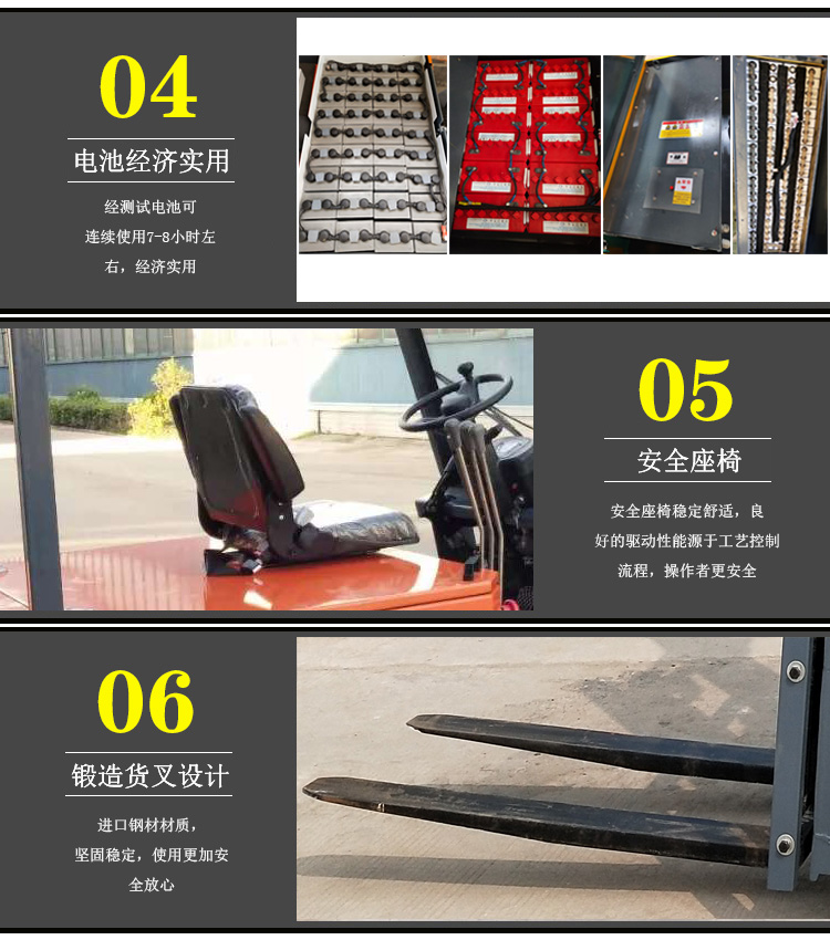 全系标配朝阳轮胎,全交流电机电控,理士专用牵引电池,合力液压油缸系