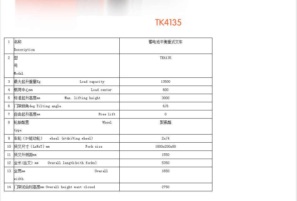 MiMA(米玛)13.5吨蓄电池平衡重式叉车