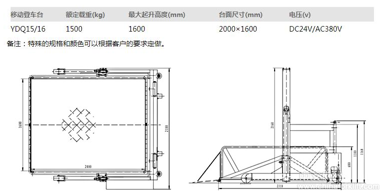 产品简介:YDQ移动式登车台适用于仓库、码头、工场货物的装卸。该系列移动登车台采用液压动力起升,操作简单方便;提升动力可采用380V/AC和直流电机两种动力单元。采用直流电机时随车配备高性能电瓶及内置式充电器。