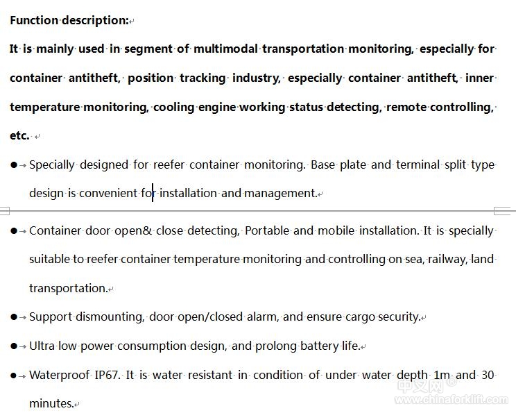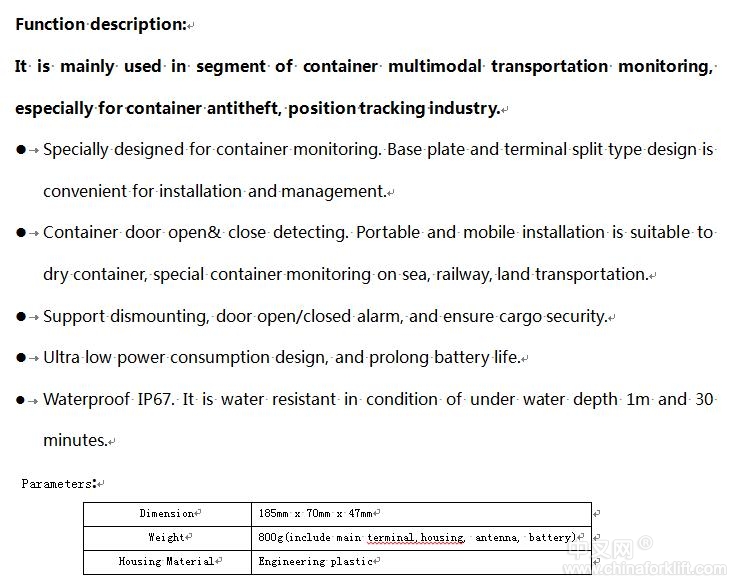 主要应用于集装箱多式联运监控细分行业,特别是集装箱防盗、箱内温度检测、冷机工作状态检测、远程控制等领域。 ● 专为冷箱监控设计,底座加主机分体设计方便安装管理。 ● 箱门开关检测、移动便携安装特别适合冷箱在海运、铁路、公路运输中的温度检测与控制。 ● 支持拆卸及开关门报警确保物品安全。 ● 低功耗设计,延迟电池使用寿命。 ● 防水符合IP67标准,1米深水下保持30分钟不进水。