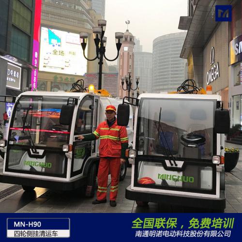 明诺电动四轮侧挂桶垃圾清运车 垃圾箱倾倒垃圾无残留,MN-H90是一款纯电动侧挂桶清运车,该车集翻桶装置和垃圾自卸装置于一体,适用于环卫、保洁部门运输垃圾。纯电动侧挂桶清运车,采用铆接式汽车用底盘设计,可装载120L/240L标准垃圾桶,可以灵活穿梭背街小巷,可用于环卫部门、物业保洁、学校、大型园区等场所的垃圾分类收集清运。