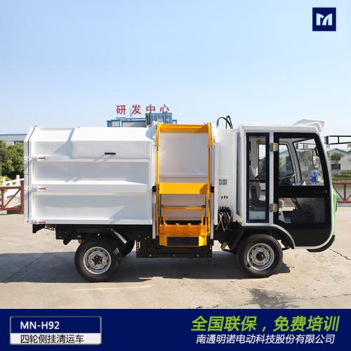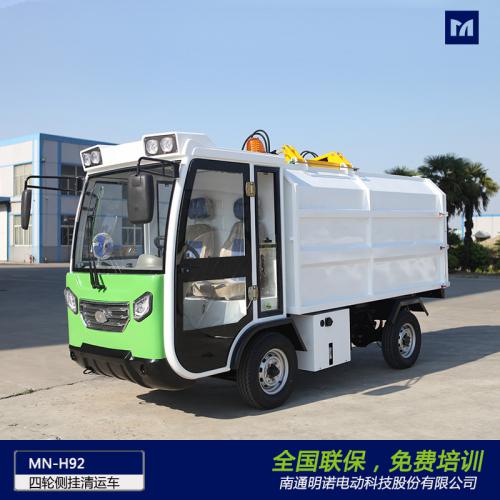 明诺电动四轮侧挂桶垃圾清运车 4立方垃圾箱容量大,MN-H92是一款纯电动侧挂桶清运车,该车集翻桶装置和垃圾自卸装置于一体,适用于环卫、保洁部门运输垃圾。采用铆接式汽车用底盘设计,可装载120L/240L标准垃圾桶,可以灵活穿梭背街小巷,可用于环卫部门、物业保洁、学校、大型园区等场所的垃圾分类收集清运。