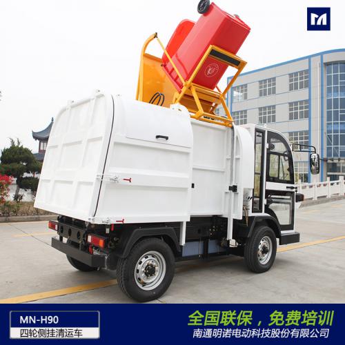 明诺电动四轮侧挂桶垃圾清运车 垃圾箱倾倒垃圾无残留,MN-H90是一款纯电动侧挂桶清运车,该车集翻桶装置和垃圾自卸装置于一体,适用于环卫、保洁部门运输垃圾。纯电动侧挂桶清运车,采用铆接式汽车用底盘设计,可装载120L/240L标准垃圾桶,可以灵活穿梭背街小巷,可用于环卫部门、物业保洁、学校、大型园区等场所的垃圾分类收集清运。