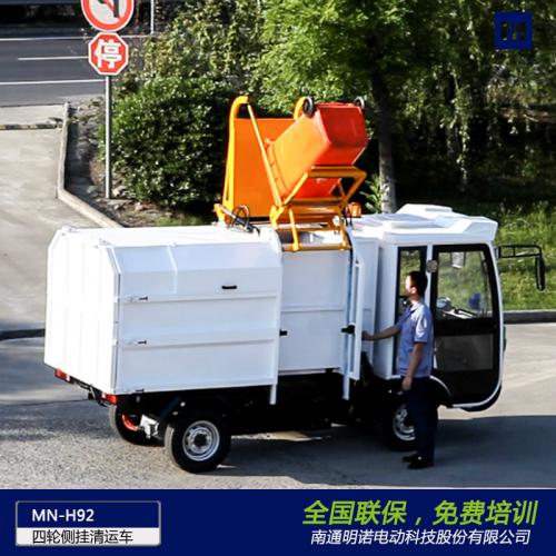明诺电动四轮侧挂桶垃圾清运车 4立方垃圾箱容量大,MN-H92是一款纯电动侧挂桶清运车,该车集翻桶装置和垃圾自卸装置于一体,适用于环卫、保洁部门运输垃圾。采用铆接式汽车用底盘设计,可装载120L/240L标准垃圾桶,可以灵活穿梭背街小巷,可用于环卫部门、物业保洁、学校、大型园区等场所的垃圾分类收集清运。