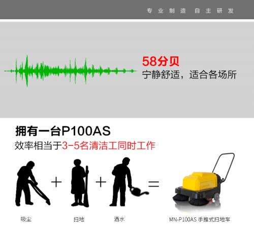 电动手推式扫地机清扫效率是人工的2-3倍,每天用电成本1-3元,能节约成本10%以上,电动扫地机在物业保洁行业内特别受欢迎。MN-P100AS电动手推式扫地机技术成熟,扫地机集扫地、吸尘、喷水为一体,推行轻便,经济环保,代替人工扫把扫地的先进工具。扫地机产品介绍,扫地机设备配比,成本经济分析等定制化项目方案,请致电明诺。