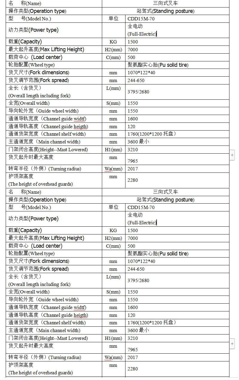 三向叉车门架专用槽钢。电动仓储叉车侧拉式电池。三向叉车外置48V智能充电器。电动三向叉车高耐磨的聚氨酯实心轮胎。三向叉车油缸安全切断阀。电动三向叉车带有电磁式刹车制动系统,电子转向。
