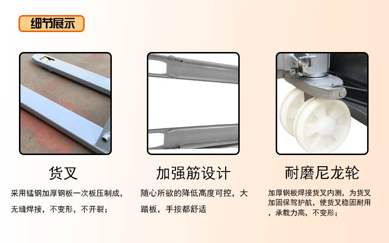 手动托盘搬运车车身采用三菱全自动机器人焊接,位置准确,焊接标准化,焊口平滑美观,焊接牢固不开裂;手动托盘搬运车采用加粗弹簧,高猛材质,弹性强,不易断,电镀锌工艺,防腐防锈;手动托盘搬运车货叉加厚加筋,提高强度,确保摇臂载重不易变形。
