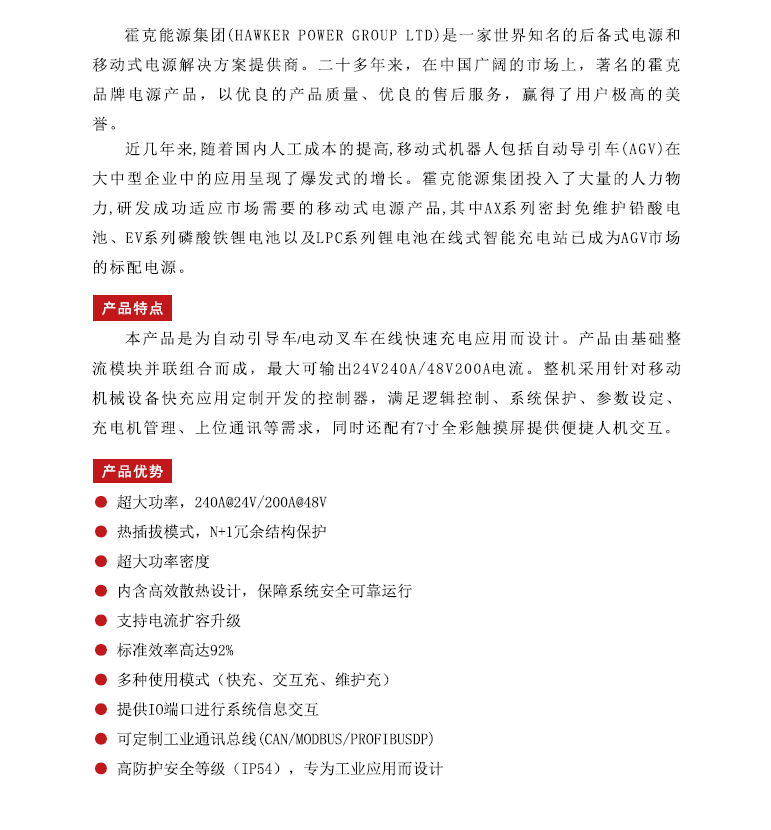 霍克电池集团投入了大量的人力物力,研发成功适应市场需要的移动式电源产品,其中AX系列密封免维护铅酸电池、EV系列磷酸铁锂电池以及LPC系列锂电池在线式智能充电站已成为AGV市场的标配电源。