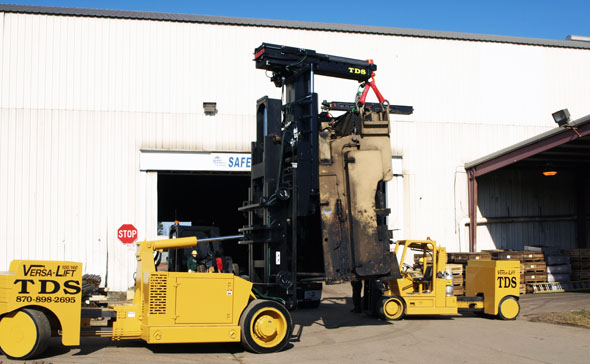 100/140 Versa-Lift 是市场上最大的叉车。它可以轻松举起 100,000 磅,甚至是 140,000 磅加长的底座。