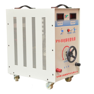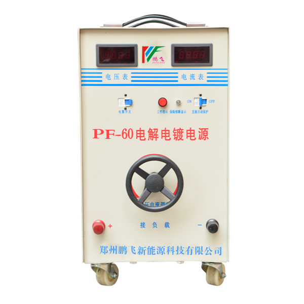 本公司生产的PF-60电解电镀电源能自动消除电网电压波动及其它扰动对镀件质量的影响,能在电网电压波动时不影响输出电压电流。数字显示直观明了,操作简单方便,控制精度高,性能稳定,操作简单,低噪音,明显的节能省电。并设有有输入过压保护,欠压保护,短路保护,过流保护等。可靠性强,保证设备安全运行,减少故障发生。PF-60电解电镀电源是大、中、小型企业用于处理青铜器仿古、机械配件,小型机械壳体、金属工艺品老化、复古、镀金、银、铜、镍、锌、铬、锡等电镀行业等的理想设备。另有青铜器仿古技术培训指导欢迎您的致电!PF-60电解电镀电源技术指标: