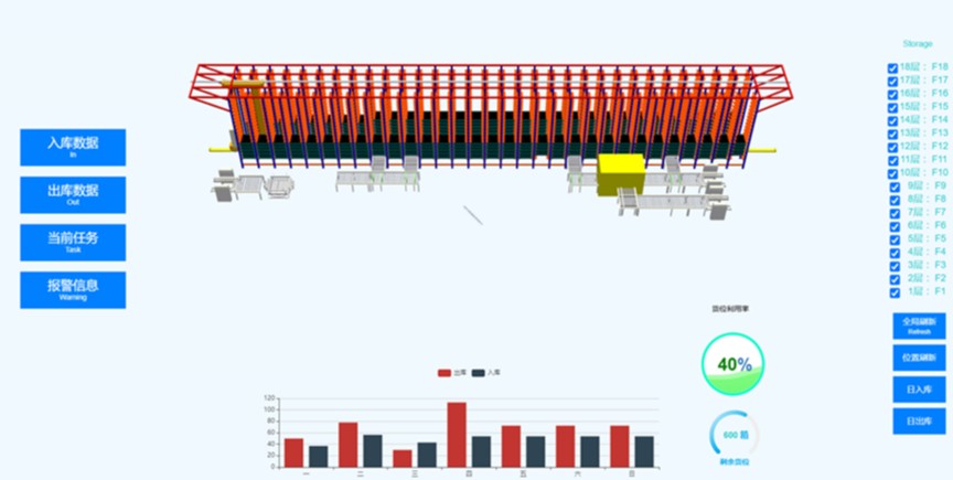 提供自动化立体仓库三维展示,通过wms系统同3D系统对接,实现实时查看立库设备的运行状态,货位存储情况以及货位利用率