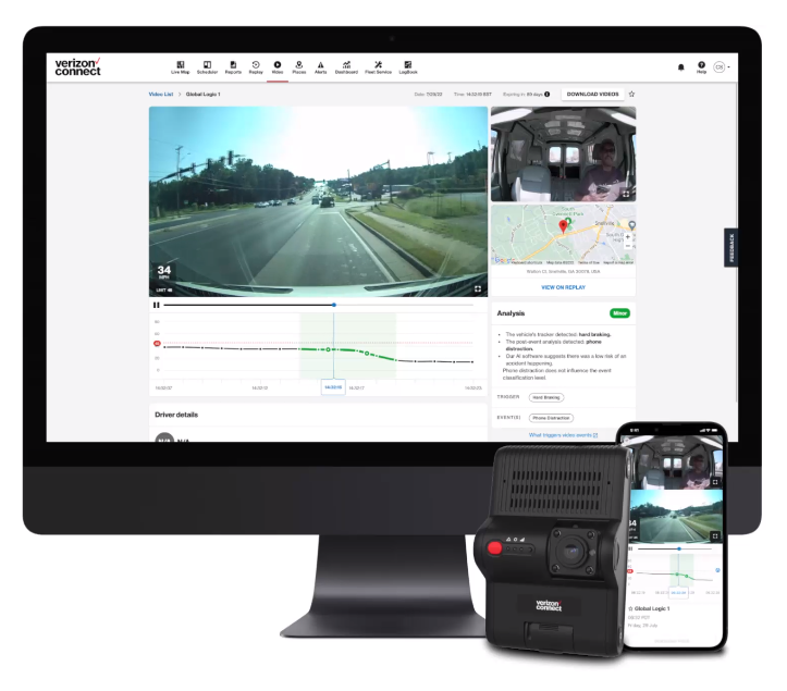 控制车队安全以帮助预防事故。自动为分心的驾驶员实时播放驾驶室内的声音警报,并并排查看面向道路和驾驶员的摄像头画面。