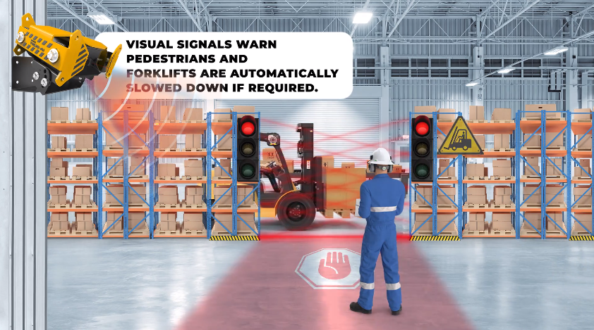 叉车行人安全系统通过高精度 UWB 技术检测配备可穿戴标签的行人的接近度。当行人比预先配置的阈值更近时,系统分两个阶段将叉车限制在安全速度。声音和视觉信号帮助叉车操作员注意到附近的行人,即使在盲点,并采取相应的行动。可穿戴标签通过与距离成正比的振动水平警告行人。该系统确保了安全的工作环境,即使对于有听力障碍的工人也是如此。
