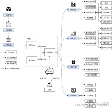 运维监控:对项目运维情况进行监控,包括设备拓扑网络、运维报警监控、无效数据、设备报表分析;设备调试:对设备进行远程在线调试;OTA升级:上传新的升级包,并将OTA升级消息推送给设备,设备即可在线升级;日志服务:包括设备全生命周期日志、用户操作日志等;业务工单:支持业务运作的跨部门协作工单,此工单内容根据企业业务不同会有较大差异,此处不做具体展开说明。