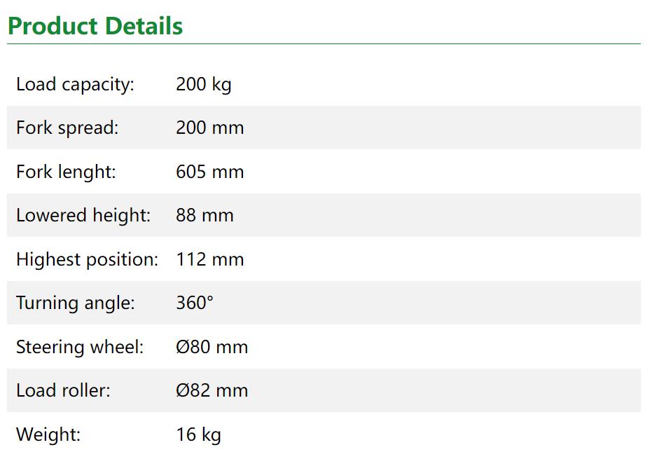 This pallet truck is specially made for handling pallets in supermarkets and small stores. It is ideal for handling quarter and display pallets.