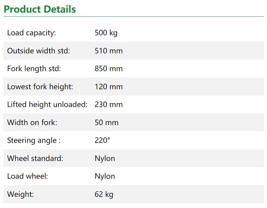 The pallet truck has a reliable closed hydraulic system with automatic neutral position valve. The polished pistons and cylinders ensure a long and reliable service life. The automatic neutral position ensures that when you move the handle slowly, the forks will not be lifted. The draw bar is moved more quickly and lifts the carriage normally.