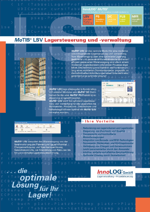它代表了所有类型存储的最佳仓库控制和管理。使用MoTIS® LSV可以优化管理原材料、生产、分销和运输仓库。从收货开始,从托盘和存储辅助设备的接收开始,批次跟踪和阻塞标记、重量控制、退货处理直至存储空间的最佳确定。