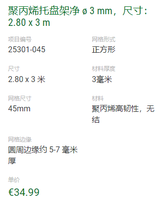 聚丙烯托盘架净 ø 3 mm,尺寸:2.80 x 3 m