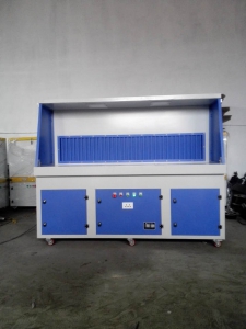 分离:在工作台面进行焊 接或打磨过程中,会产生大量烟尘、粉尘、火星以及大的金属颗粒,独特的设计使得大的金属颗粒由于自重而顺着导灰板自动落入盛灰抽屉;而一些细小的烟尘粉尘,以及火星被吸风口高压的气流捕捉到,而进入过滤系统中。过滤系统为两级过滤,火星以及一些小的颗粒被防火阻燃板挡住,以免对滤芯造成损害;而烟尘粉尘经过阻燃板,被吸附在滤芯表面,干净的空气便随着高压气流经过风机被排放出来。