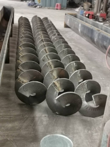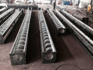 螺旋输送机旋转轴上焊的螺旋叶片,叶片的面型根据输送物料的不同有实体面型、带式面型、叶片面型等型式。螺旋输送机的螺旋轴在物料运动方向的终端有止推轴承以随物料给螺旋的轴向反力,在机长较长时,应加中间吊挂轴承。