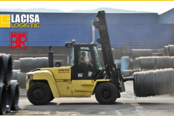 重型叉车模拟器,带驾驶室和车辆真实仪表,带后投影墙的显示系统。Tenaris Dalmine (BG) 工厂内用于处理石油管道管包的管场场景。