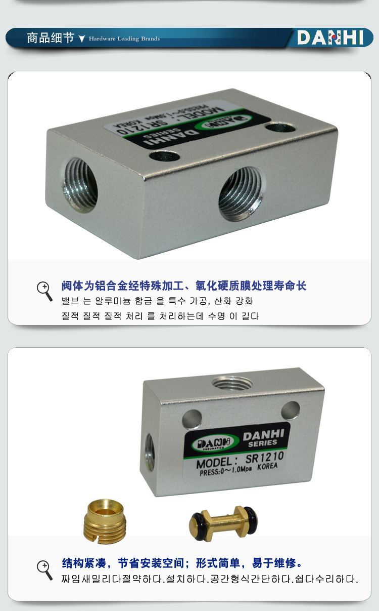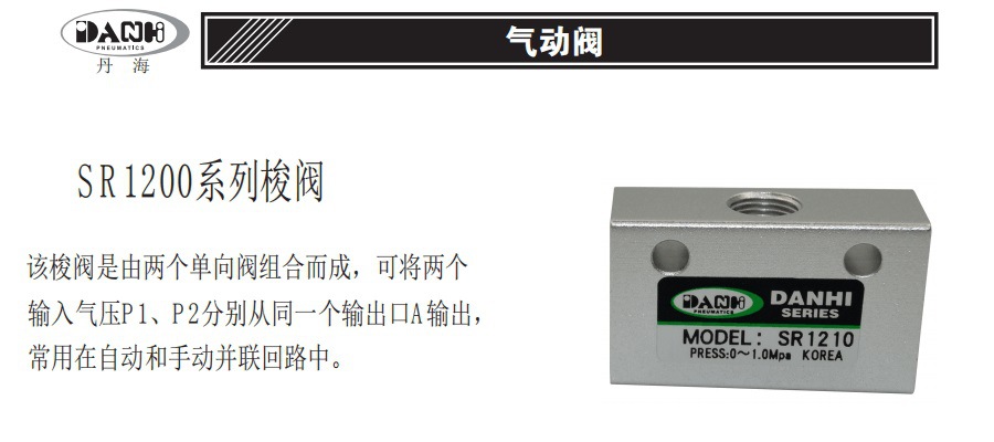 韩国DANHI丹海气动元件,SR系列梭阀,梭动阀,高低压三通阀,高低压自动换向阀:SR1210,SR1220,SR1230,SR1240,SV-50,SV-01,SV-02,SV-03,SV-04。