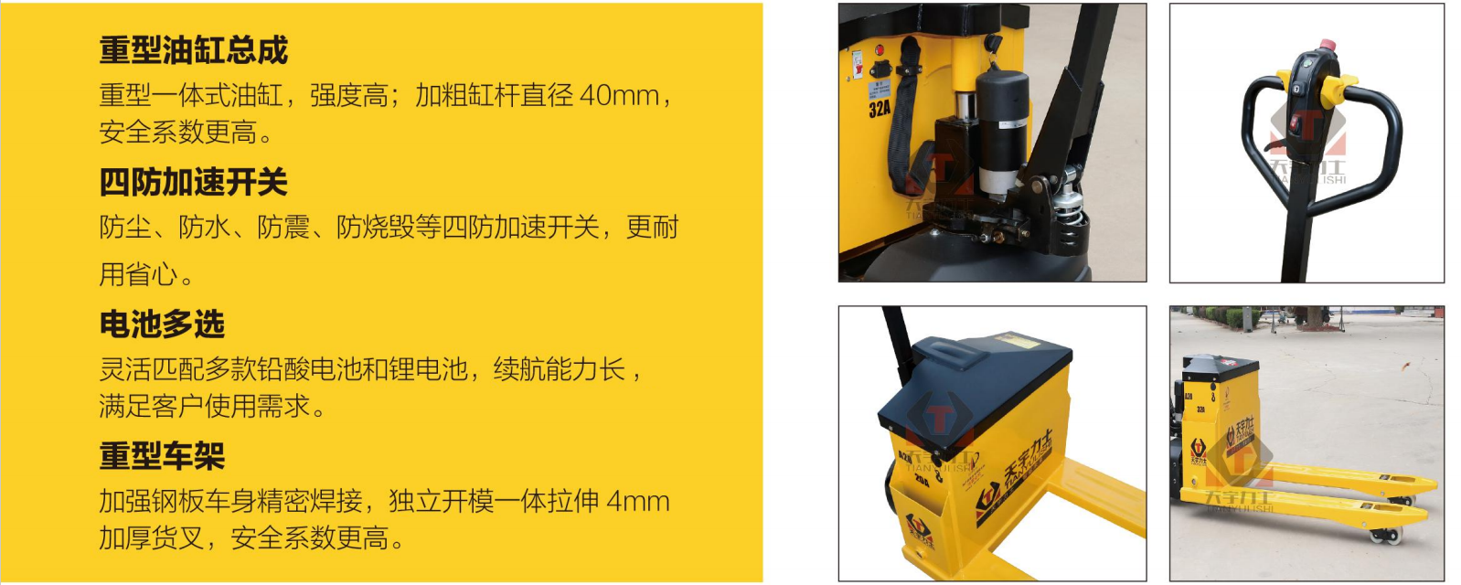 重型车架: 加强钢板车身精密焊接,独立开模一体拉伸 4mm加厚货叉,安全系数高。